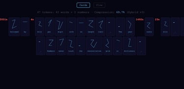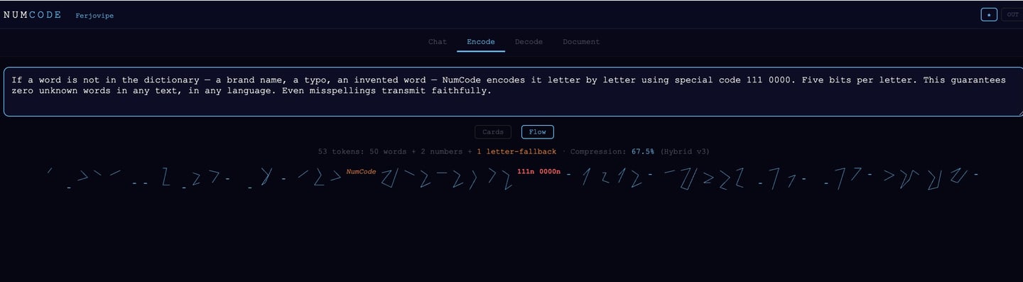 NumCode encodes text from any language as numeric sequences. Each word receives a unique ID based on its real frequency of use, extracted from millions of authentic texts. That ID can be transmitted as binary, rendered as a geometric ideogram, or — in the future — projected as a pattern of light. It is not AI. It is not a translator. It is not lossy compression. It is a new layer between meaning and transmission.
