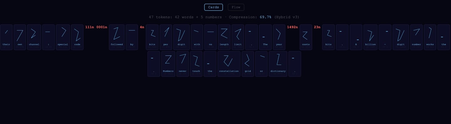 Numbers use their own channel: special code 111 0001 followed by 4 bits per digit with no length limit. The year 1492 costs 23 bits. A billion-digit number works the same way. Numbers never touch the constellation grid or dictionary.