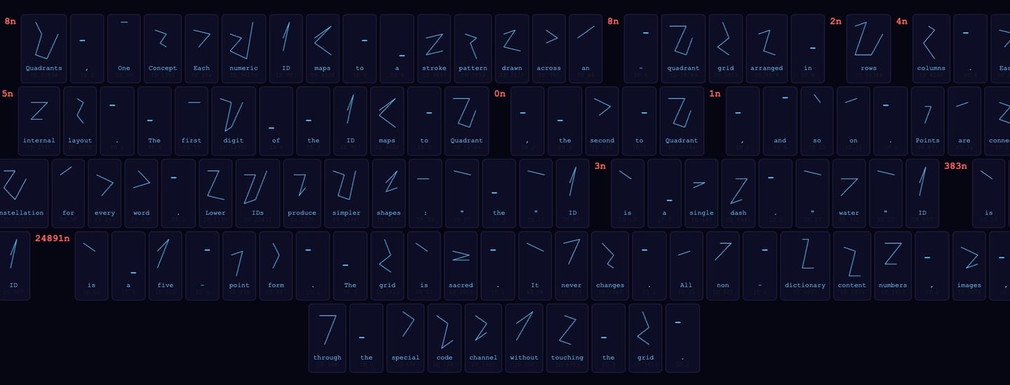 The grid is sacred. It never changes. All non-dictionary content (numbers, images, sound, encryption) routes through the special code channel without touching the grid.
