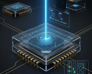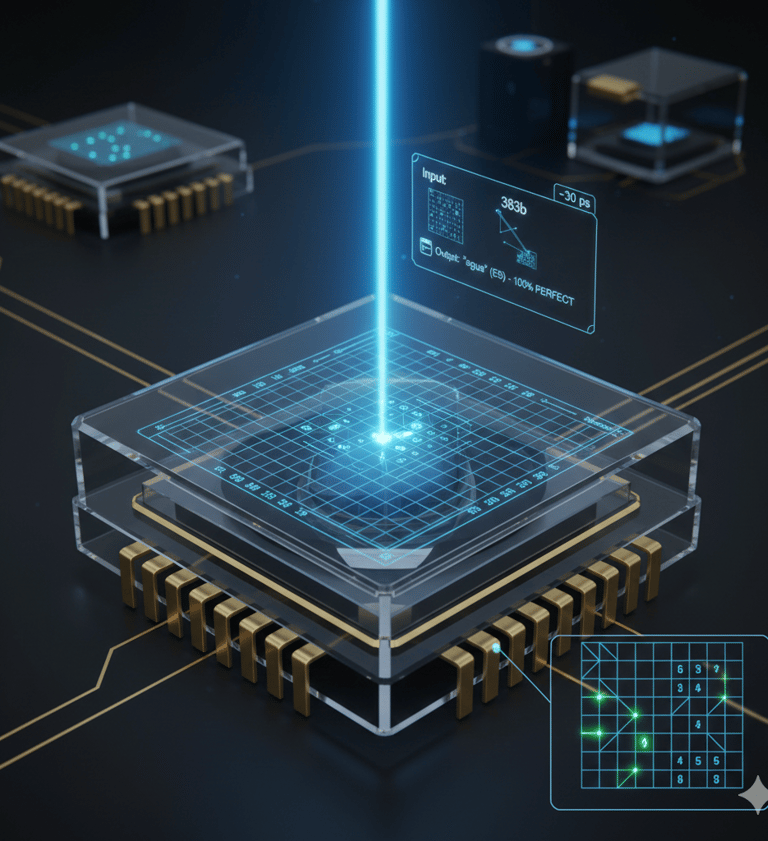 The ideogram grid becomes a physical mask. A continuous-wave laser projects through it. One flash = one complete concept. Theoretical latency: sub-30 picoseconds per symbol.